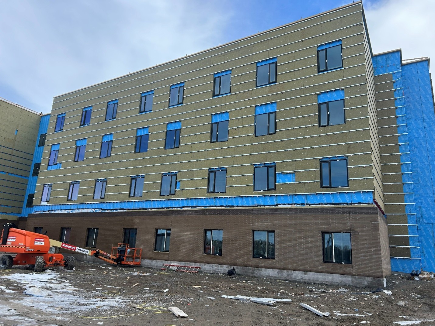 Riverview Manor is also moving quickly, having reached a major milestone with the superstructure now fully complete. Exterior progress is strong, with waterproofing finished in Divisions 1 through 4 and underway in Division 5. Exterior cladding and siding have begun in Divisions 1 and 2, and insulation work continues across all divisions. Windows are now installed throughout the entire building, and masonry has been completed in Divisions 1 through 4, with the final division nearing completion. Inside, framing has wrapped up on the first and second floors and is ongoing on the third floor. Electrical rough-ins are steadily progressing on the first floor and have recently begun on the second. Mechanical rough-ins continue across all divisions on the first floor, while the sprinkler system is being roughed in on the third floor. Topping has been poured on all levels except for the fourth floor and roof of Division 4. With temporary heat now operating throughout the building, interior work has been able to continue without interruption despite winter conditions.